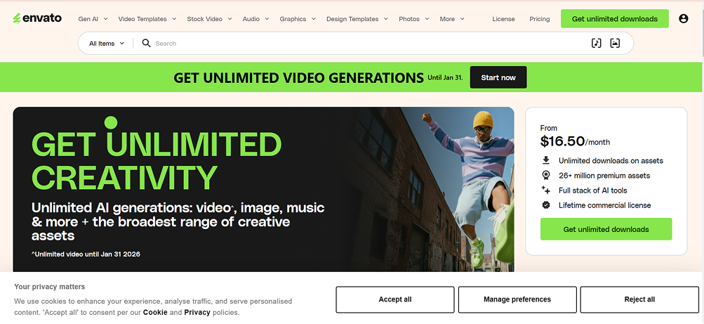 If you’re a video editor who also designs social assets or brand visuals, Envato can cover almost everything in a single subscription.